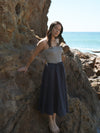 The Nina Skirt is a timeless piece designed with beautiful movement and an easy, everyday feel. Featuring a high elastic waistband and a full, flowy silhouette, it drapes gracefully for a flattering and comfortable fit. The midi length and classic shape make it easy to dress up or down throughout the seasons! Pair it with a simple tee or lightweight knit for a polished look you’ll reach for all season long!